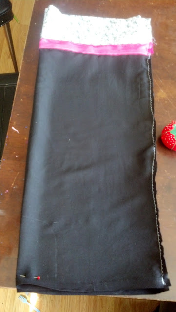 After you have them all pinned into place sew a straight line down where you have pinned. (on mine I am sewing the pink fabric to the solid black & the floral black & white print to the pink.)